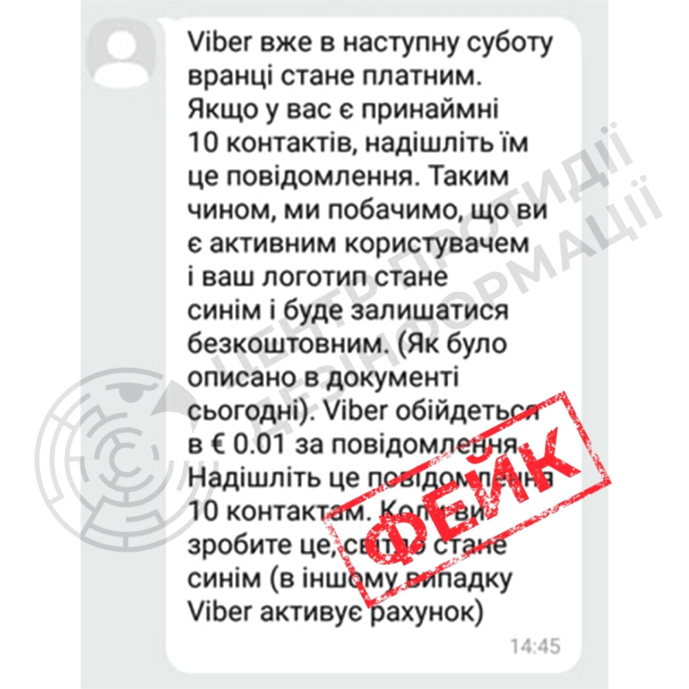Viber users are receiving false messages claiming that the messenger will become paid next Saturday. This information is inaccurate. The Center for Counteracting Misinformation under the National Security Council reports this via Telegram.