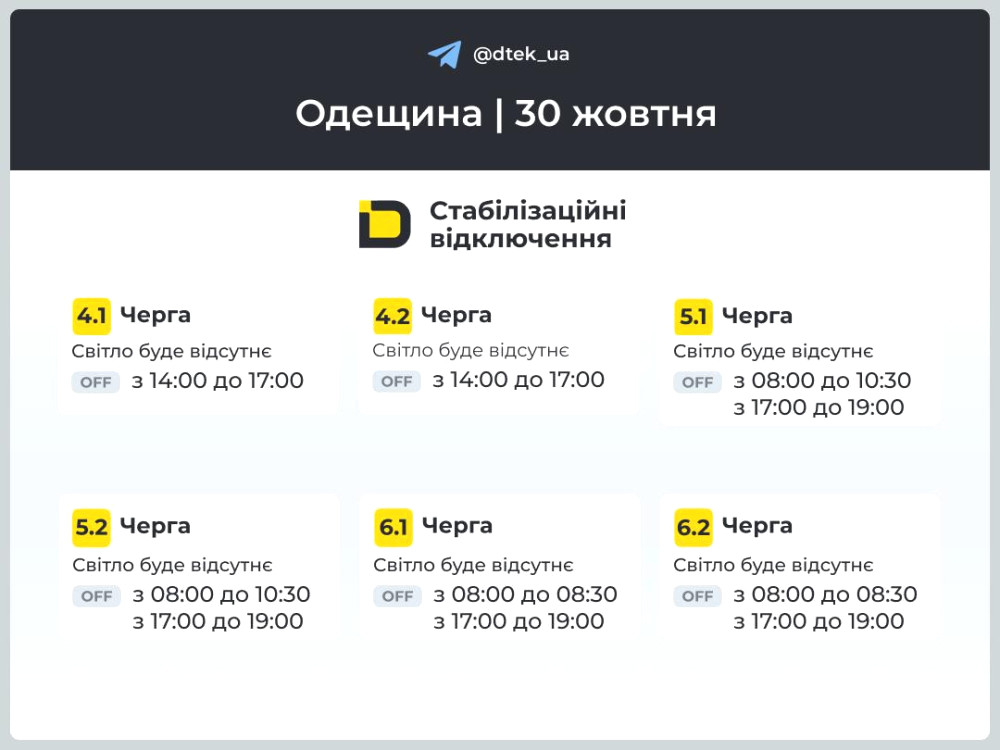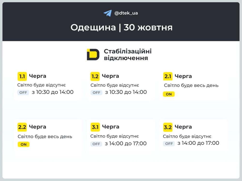 Starting today, new stabilization schedules for power outages are being implemented in the Odesa region following the directive of NEC «Ukrenergo».