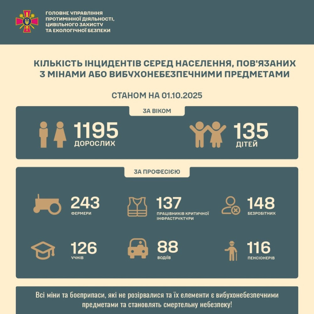 По состоянию на 1 октября 2025 года зарегистрировано, что 1 330 человек стали жертвами вражеских мин, в том числе 135 детей и 1 195 взрослых.